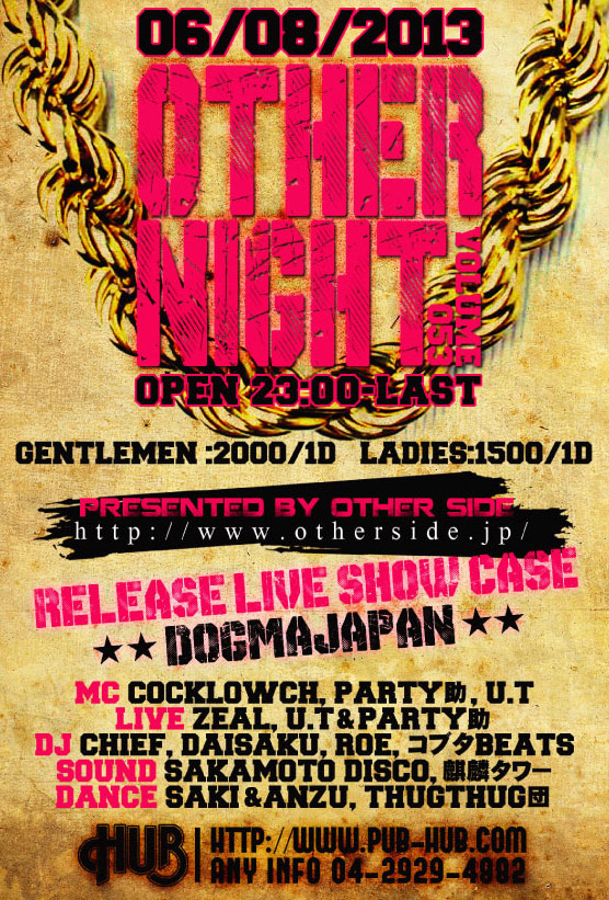 さて今年も残り半分となりました。今回はDANCEで「THUGTHUG団」が登場します。HIPHOP戦隊BBOYGERに登場する悪の軍団は、どんな形でOTHENRIGHTを占拠しに来るのでしょうか?!楽しみです。そしてDOGMAJAPANが8years-BEST OF DOGMAJAPANを5月末にリリース!と言う事でリリースライブを行います!こちらも楽しみ♪そろそろ梅雨入りしちゃいますが、その前に遊びに出掛けましょう!2009年からお客様の為に始まった「テキーラタイム」!!数量限定でのテキーラサービスなので早い者勝ちです。ガンガン呑んで騒ぎましょう。