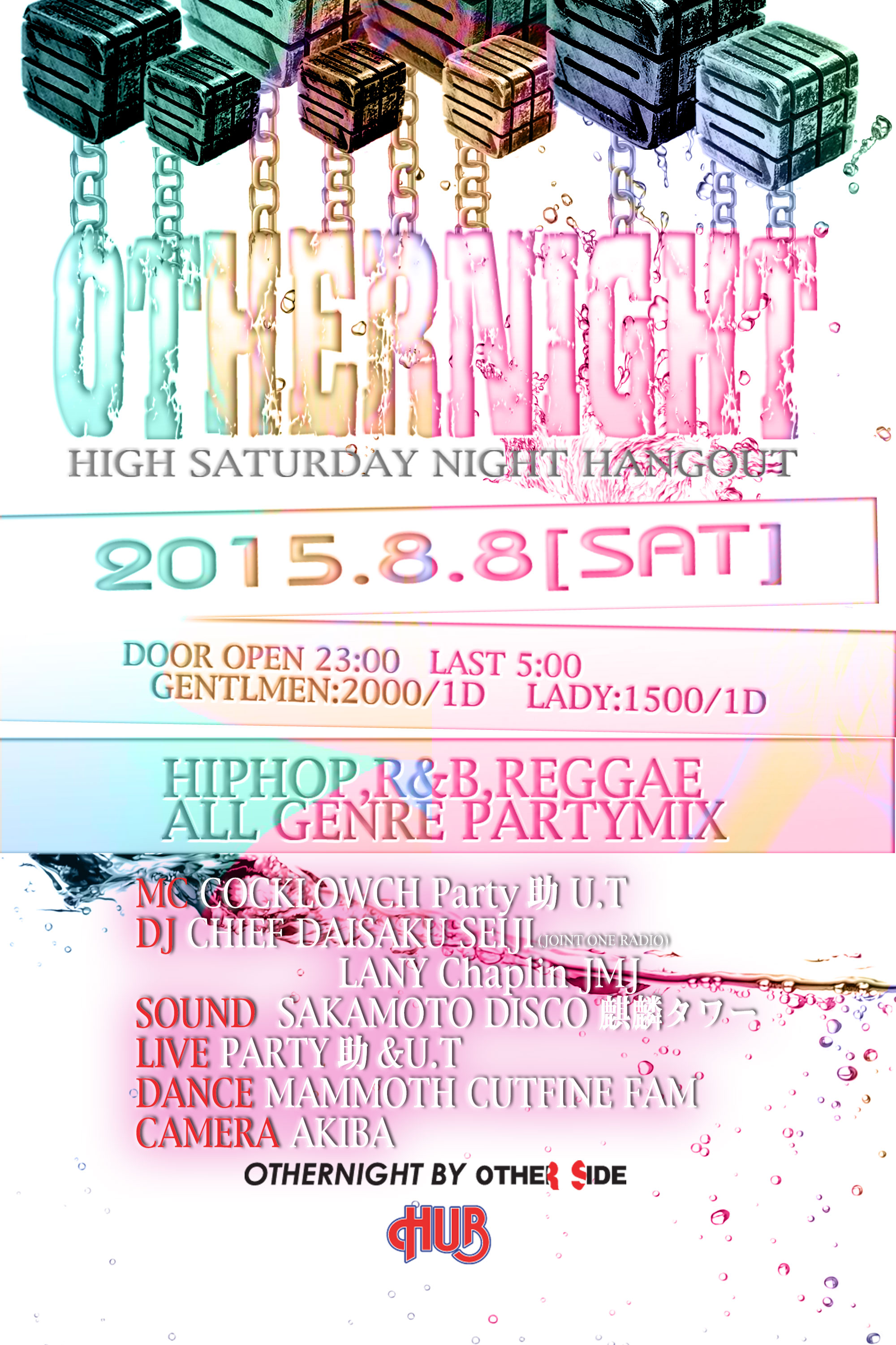 また今年も夏がやってきますね。真夏のOTHERNIGHT_SPは最近、安定感、バツグンのmammothそしてBABA-YELLOW!そしてDJはLANYもレギュラー復帰してどの時間も楽しめる選曲で朝まで楽しめます。インフォメーションにもありますがOTEHRNIGHTの2週間前には航空公園・野外ステージで「祭の達人2015」もあり昼間のパーティーも一緒に楽しみましょう!