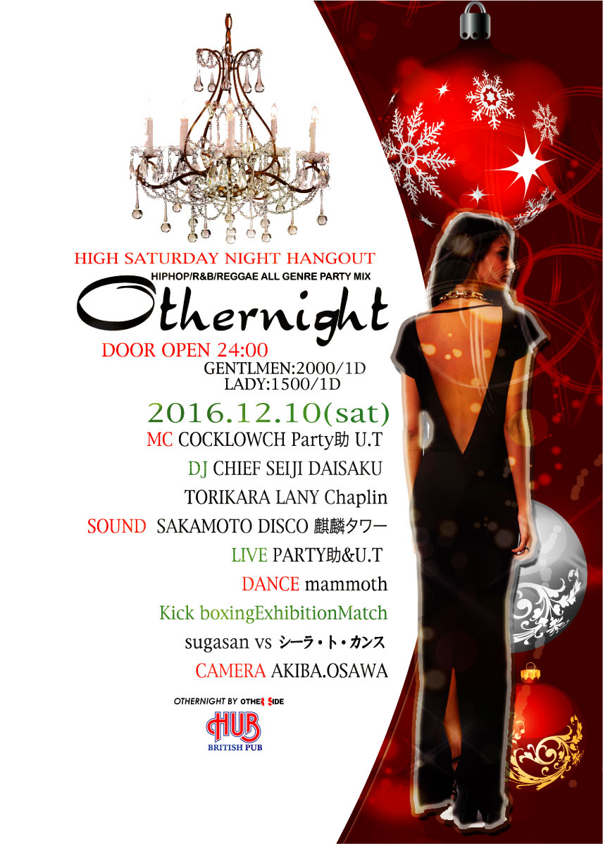 OTHEPROSSE_10周年アニバーサリーに来て頂きありがとうございました!皆さん楽しめたでしょうか?早くも今年となったOTHENRIGHTですが忘年会& ChristmasSPと題しまして久しぶりのキックボクシングエキシビジョンマッチを開催!!そして女性のお客様限定で「クリスマス仮装(小物以上)」での来場で1500円1D→1000円1Dとなります!2009年からお客様の為に始まった「テキーラタイム」!!数量限定でのテキーラサービスなので早い者勝ちです。ガンガン呑んで騒ぎましょう。