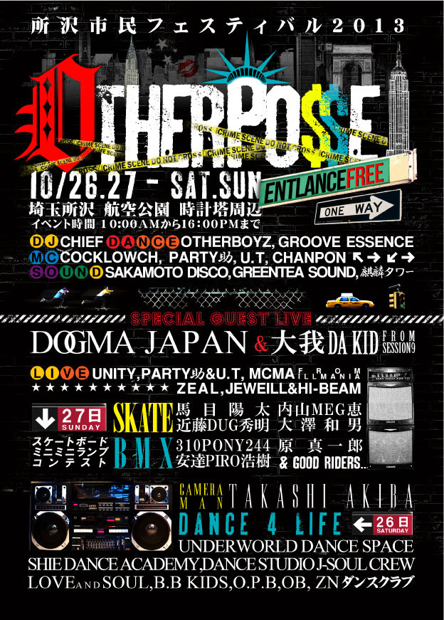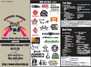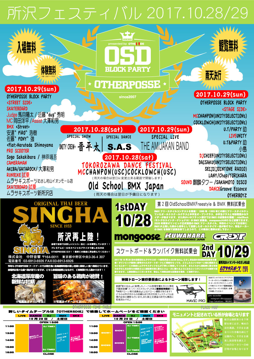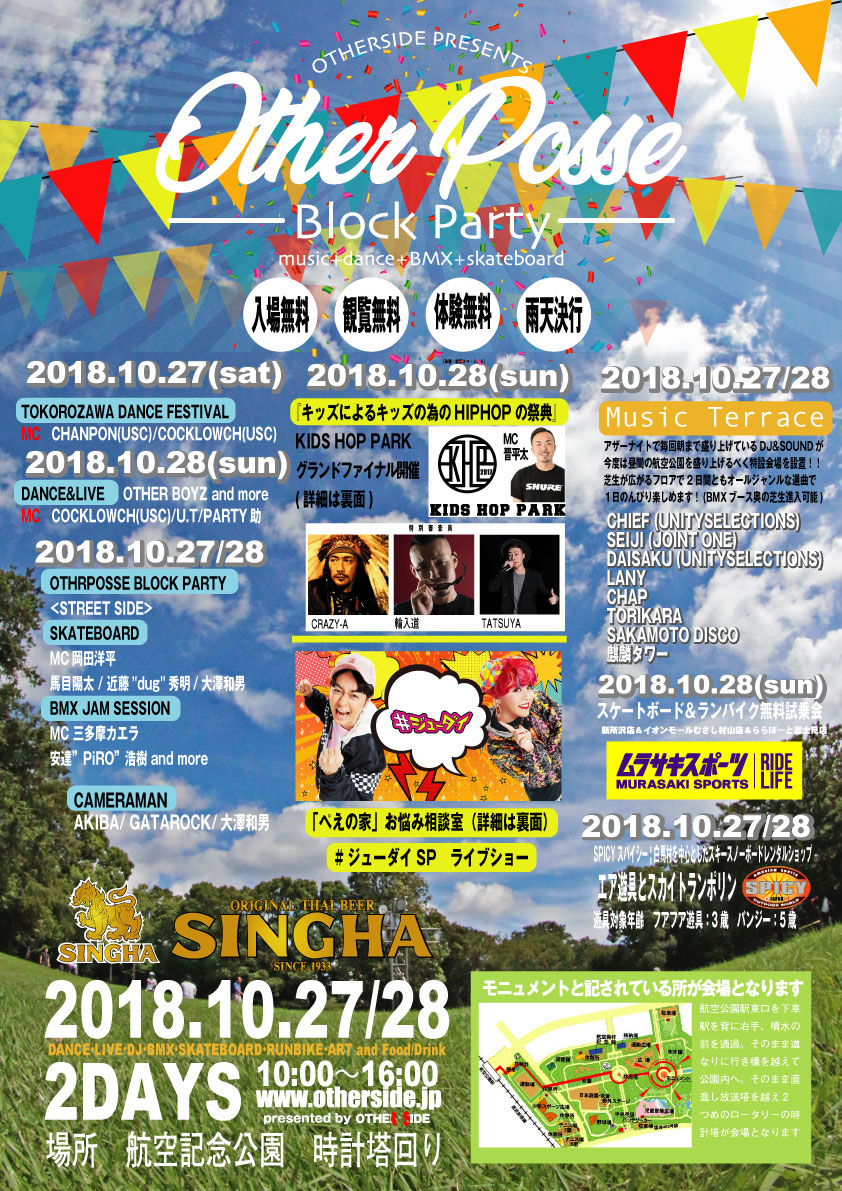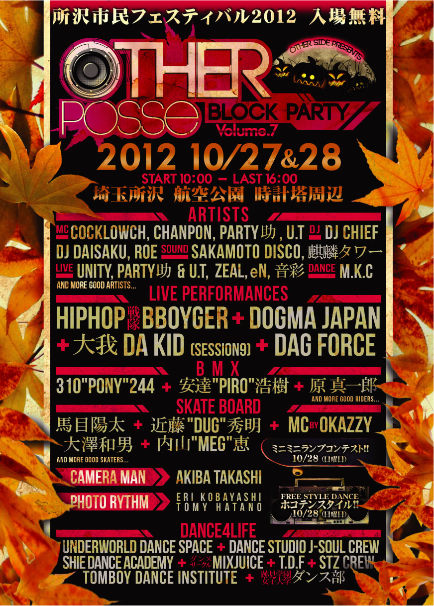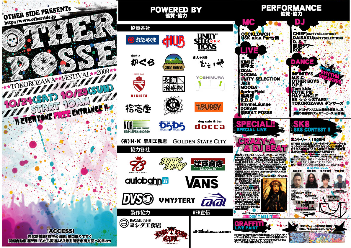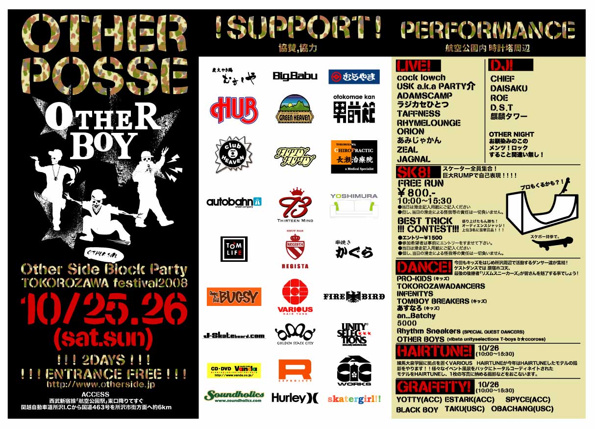 所沢のストリートシーンを身近に感じてもらおうと所沢市主催の「所沢フェスティバル」に打診し開催される事となった、いわば所沢市公認のブロックパーティーである!そこはオールジャンルな空間になっていて、SK8、Dance、Live、DJ、Graffiti、art、Photoなど様々なジャンルが1つになって2日間を盛り上げる!また、この空間の資金は所沢市にある飲食店のご好意による協賛金や当日、出店されているOTHERSIDE飲食ブースにてまかなわれているので是非、活用して欲しい。年に1度の広大な公園で緑、広がる芝生と無限に広がる青空のもと家族や友人と散歩がてら寄ってみてはいかがでしょうか。。。