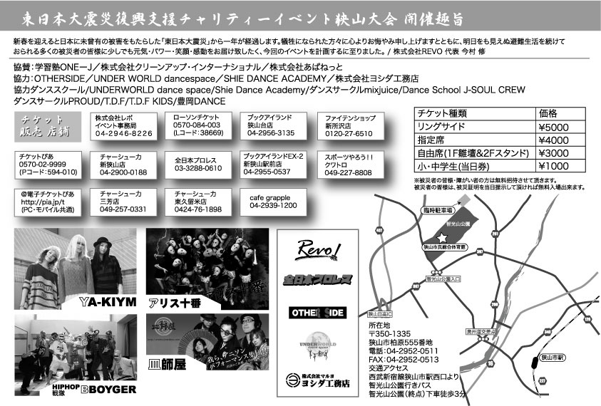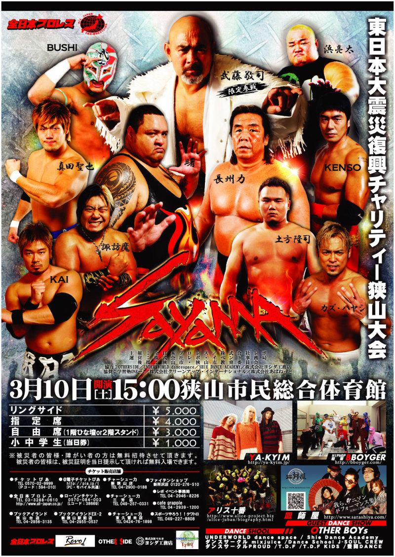 全日本プロレスhttp://www.all-japan.co.jp//株式会社レボhttp://www.revo-clean.jp/ 株式会社レボ・イベント事務局http://www.revo-clean.jp/ 狭山市・狭山市教育委員会http://www.city.sayama.saitama.jp/kyoikuiinkai/index.html OTHERSIDEhttp://www.otherside.jp/ UNDER WORLD dancespacehttp://www.underworld-s.com/ SHIE DANCE ACADEMYhttp://www.shiedance.com/ 株式会社ヨシダ工務店http://www.maruyok.com/ 学習塾ONEーJhttp://one-j.com/ (株)クリーンアップ・インターナショナルhttp://www.cleanup-int.com/ (株)あぱねっとhttp://www.apa-net.co.jp/company/index.html (株)七星科学研究所☆(有)ニュー・ワールド・オーダー☆(有)チャーシュー力☆力士料理もとはし ☆(医)昌静会金村産婦人科クリニック☆(医)石心会狭山病院☆ Casual Dinig BUGSY☆Running Dream(株)☆(有)セレーネ☆Stylish Club凛☆ 服部塗装☆地鶏の元☆山徳興業(株)☆佐々木電気☆フィットネスクラブ ポロッキー☆ (有)諸井工務店☆本田技研工業(株) 埼玉製作所☆(医)尚寿会大生病院☆関口社会保険労務士事務所☆株式会社ツインズ・ハーバー☆(有)ぽぷり☆らーめん こてつ☆ (株)アンテック・オペレーション・システム☆(株)湘南音響☆ 協和工業(株)☆(株)創美社☆司法書士大倉忠之事務所☆(株)エコロテック☆ (株)ネギシ商会☆(株)浅野商店☆鹿児島第一フラワー(株)☆ (株)SANBI☆三国コカ・コーラボトリング(株)☆牛窪税務会計事務所☆ (有)ブルーロード警備☆トリダイニング ルーツストーン☆ハッピーオレンジ アヴァンタージュ美容室☆(株)トヨトミクリーンサービス チケットぴあ0570‐02‐9999(Pコード:594‐010) @電子チケットぴあhttp://pia.jp/t(PC・モバイル共通) ローソンチケット0570‐084‐003(Lコード:38669) 全日本プロレス03‐3288‐0610http://www.all-japan.co.jp/ チャーシュー力 http://www.cha-shu-riki.com/ 新狭山店04-2900-0188 三芳店049-257-0331 東久留米店0424-76-1898 ファイテンショップ新所沢店0120-27-6510 http://2031.phiten.com/access.aspx ブックアイランド狭山台店04-2956-3135 http://www12.ocn.ne.jp/~bisayama/ ブックアイランドEX‐2新狭山駅前店04-2955-0537 cafe grapple04-2939-1200 http://www.cafe-grapple.com/ スポーツやろう!!クワトロ049-227-8808 http://www.spoyaro.com/ ![]() ![]()